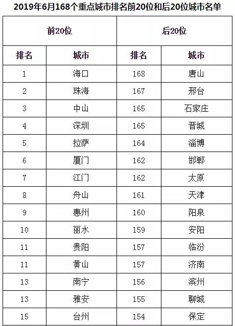 2019年6月,168個重點城市中唐山、邢臺、石家莊市等20個城市空氣質量相對較差(從第168名到第149名);海口、珠海、中山市等20個城市空氣質量相對較好(從第1名到第20名,見附表1)。