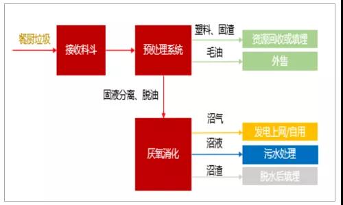 餐廚垃圾的特點包括有機物含量高,含水率高,易腐爛變質(zhì),易發(fā)酵、發(fā)臭,主要是采用厭氧消化、好氧堆肥和飼料化工藝等生物法進行處理。其中厭氧消化工藝能最大化回收油脂,無害化程度高,并能夠充分地對餐廚垃圾中的有機物進行資源化回收和利用,已經(jīng)有超過70%的餐廚垃圾處理項目使用這條技術(shù)路線,是現(xiàn)階段的主流工藝路線。