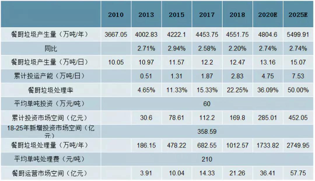 2025年全國餐廚垃圾產(chǎn)能有望達到7.53萬噸/日。餐廚垃圾產(chǎn)量方面:按照城鎮(zhèn)人口每人每天0.15kg餐廚垃圾產(chǎn)量進行計算,全國餐廚垃圾產(chǎn)量從2010年的3667萬噸提升至2018年的4552萬噸,復(fù)合增速達2.74%,按此增速推算,2025年全國餐廚垃圾產(chǎn)量有望達到5500萬噸。餐廚垃圾產(chǎn)能方面:2013年全國餐廚垃圾處理能力0.51萬噸/日,截至2017年10月,全國已形成1.87萬噸/日的餐廚垃圾處理能力,復(fù)合增速達40.35%。然而截至十二五期末,全國的餐廚垃圾處理產(chǎn)能為1.31萬噸/日,占十二五政策規(guī)劃要求的43.38%,假設(shè)十三五期間新增3.44萬噸/日的產(chǎn)能規(guī)劃目標(biāo)能夠全額完成,則2020年全國餐廚垃圾處理產(chǎn)能有望達到4.75萬噸/日,餐廚垃圾資源利用率有望達到36.09%。對標(biāo)海外發(fā)達國家,據(jù)統(tǒng)計2005年起韓國全國的填埋場均不再處理餐廚垃圾,餐廚垃圾循環(huán)利用率達到90%;法國對餐廚垃圾進行強制分類,餐廚廢油循環(huán)利用率超過40%且逐漸上升;英國計劃到2025年將餐廚垃圾循環(huán)利用率提高到70%。假設(shè)我國2025年餐廚垃圾利用率達到50%,則2025年我國餐廚垃圾產(chǎn)能有望達到7.53萬噸/日,年運營處理規(guī)模有望達到2749.95萬噸。