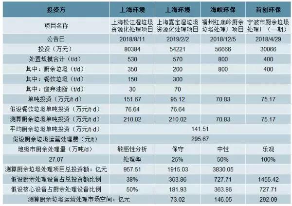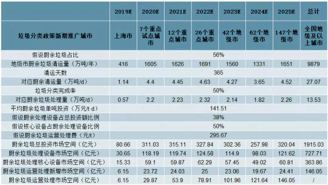 以100個餐廚垃圾試點城市的平均餐廚垃圾項目單噸投資額76.6萬元/t,處理費197元/t作為合理估計值,可得上海環(huán)境松江、上海環(huán)境嘉定、海峽環(huán)保福州、首創(chuàng)環(huán)保寧波(一期)4個項目的平均廚余垃圾單噸投資額為141.5(萬元/t)。考慮到廚余垃圾的綜合處理費較高,假設(shè)廚余垃圾處理費是餐廚垃圾的1.5倍為295.7(元//t•d),以地級及以上城市平均每天產(chǎn)生約27萬噸廚余垃圾測算,在中性情景下(即垃圾分類完成率為50%),廚余垃圾總投資額市場空間為1915億;按廚余垃圾處理設(shè)備占總投資額的38%,核心設(shè)備占廚余處理設(shè)備的50%計算,對應(yīng)市場空間為364億;2025年廚余垃圾運營處理市場的空間預(yù)計可達146億元,市場空間廣闊。