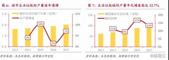 生活垃圾方面,2017年全國2017 年全年我國202個大、中城市生活垃圾產生量為2.02億噸,同比增長7.1%;城市平均產量約為100萬噸,同比增長13%,近5年來城市平均生活垃圾產量的增速已高達12.7%,相關市場人士預計2018至2020年我國城鎮生活垃圾產量分別可達到4.1億噸、4.6億噸、5.2億噸,倘若將鄉村生活垃圾合并考慮,2018年至2020年我國生活垃圾總產量分別達到4.8億噸、5.4億噸、6.1億噸。